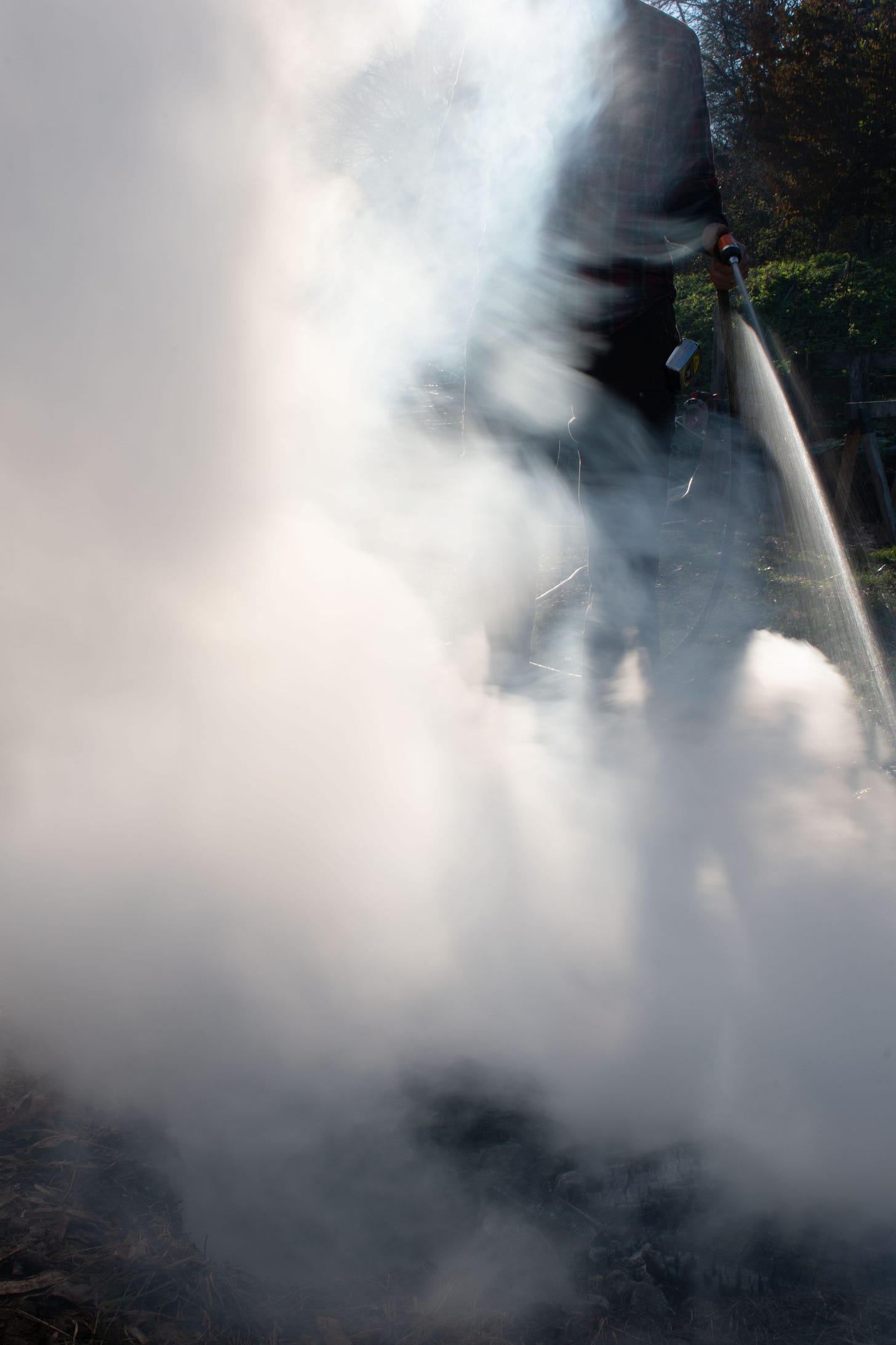 Charcoal is made by the incomplete combustion of any organic material--wood in our case. You want to stop the combustion while everything is still coal, before it all burns down to ash. The simplest way to do this, and what we did, is to dig a cone-shaped pit, start a fire at the bottom, and add consecutive layers of wood all at once. Each additional layer deprives the lower layers of oxygen, stopping the combustion. When the pit is full, the whole thing is doused thoroughly with a hose. This has the triple effect of extinguishing the fire, expanding the pores by steam, and rinsing tars and other contaminants out of the charcoal. Our pit, 4 feet across by 2 feet deep, made about 50 gallons of charcoal in a single burn. Our technique evolved, occasionally poking and prodding the pile to collapse it and fill all the gaps lower down to make the most of the volume.